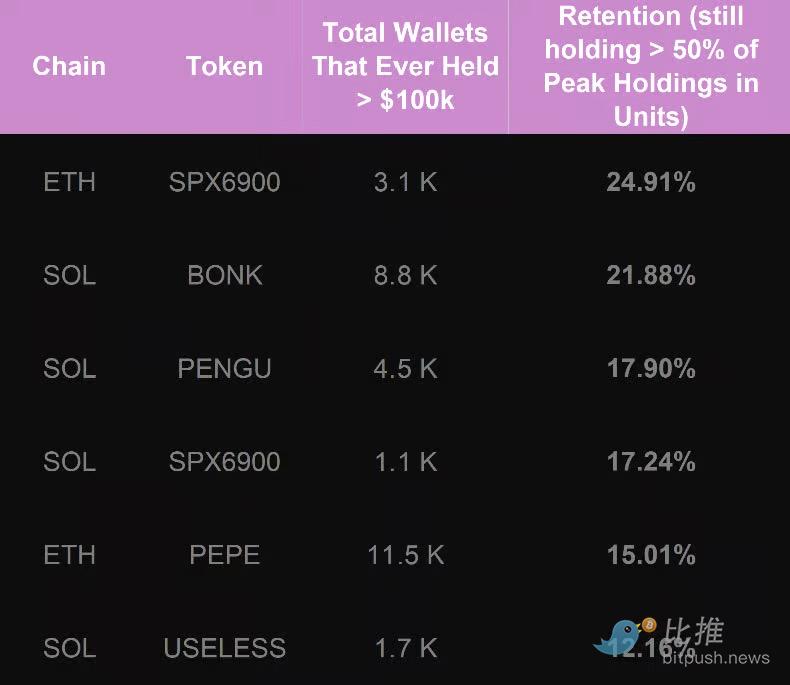 再次证明,SPX6900 在 10 万美元级别的代币持有者留存率方面处于领先地位。