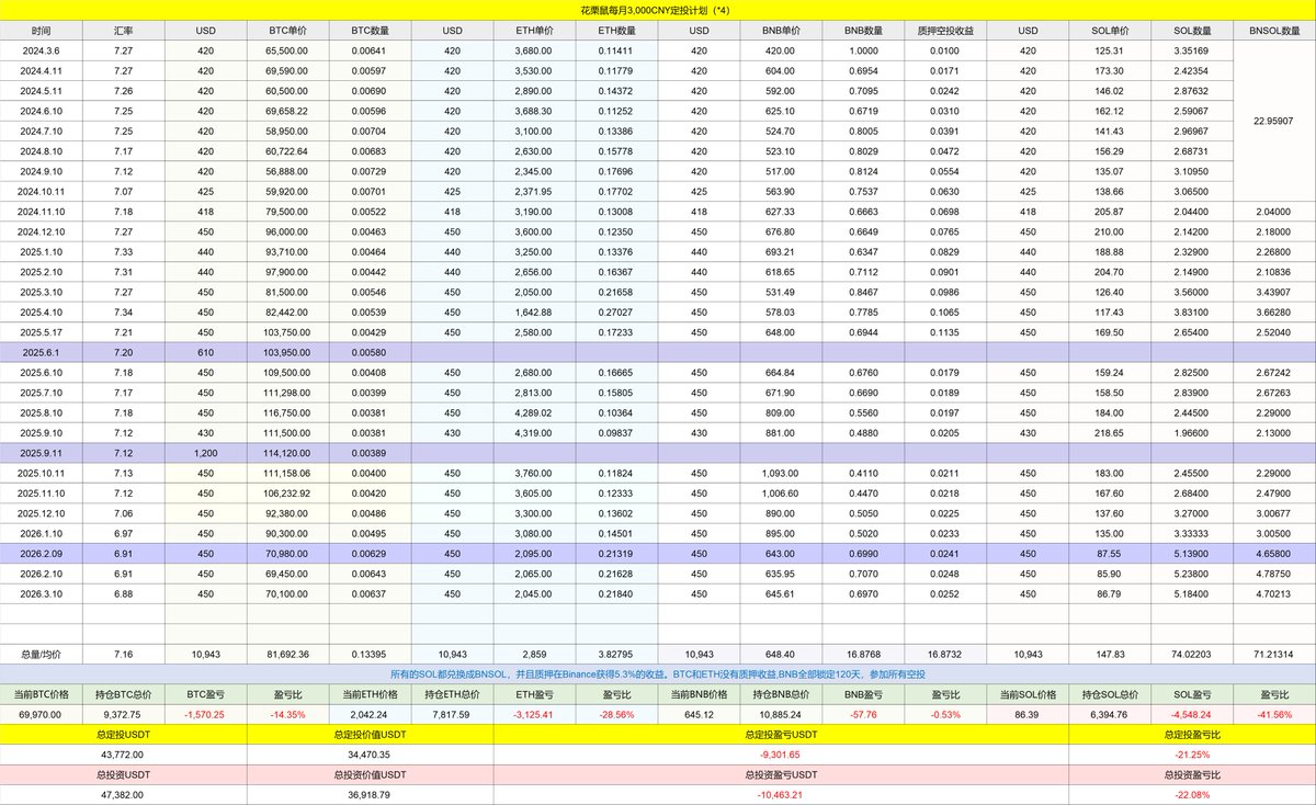这个月的定投后亏损最大的仍然是 $SOL ,当初为了弥补 $ETH 的损失选择投资的,并没有在初始的列表中,所以现在我最大的纠结就是要不要换掉 SOL ,换掉的话换成什么能继续投 70 个月的标的。