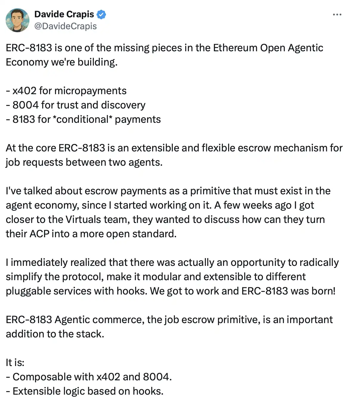 Crapis 在推特上写了他们正在搭的三层结构:x402 负责微支付,ERC-8004 负责信任与发现,ERC-8183 负责条件支付。