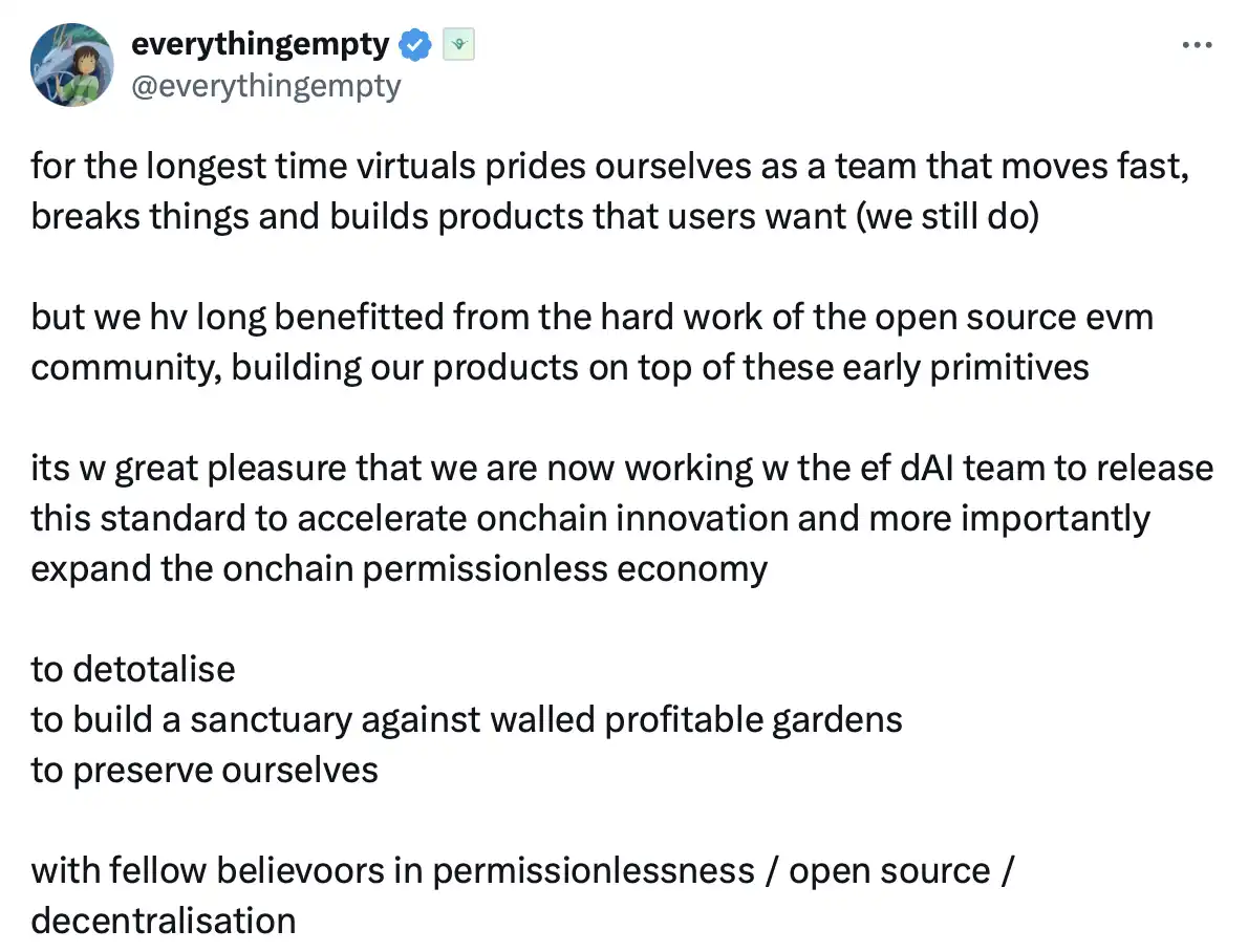 Virtuals 的核心贡献者 @everythingempty 在帖子里承认了一件事:很长时间以来,Virtuals 一直以快速行动、打破常规、打造用户真正想要的产品为傲。但他们长期受益于开源 EVM 社区的大量心血,产品就建立在这些早期基础设施之上。