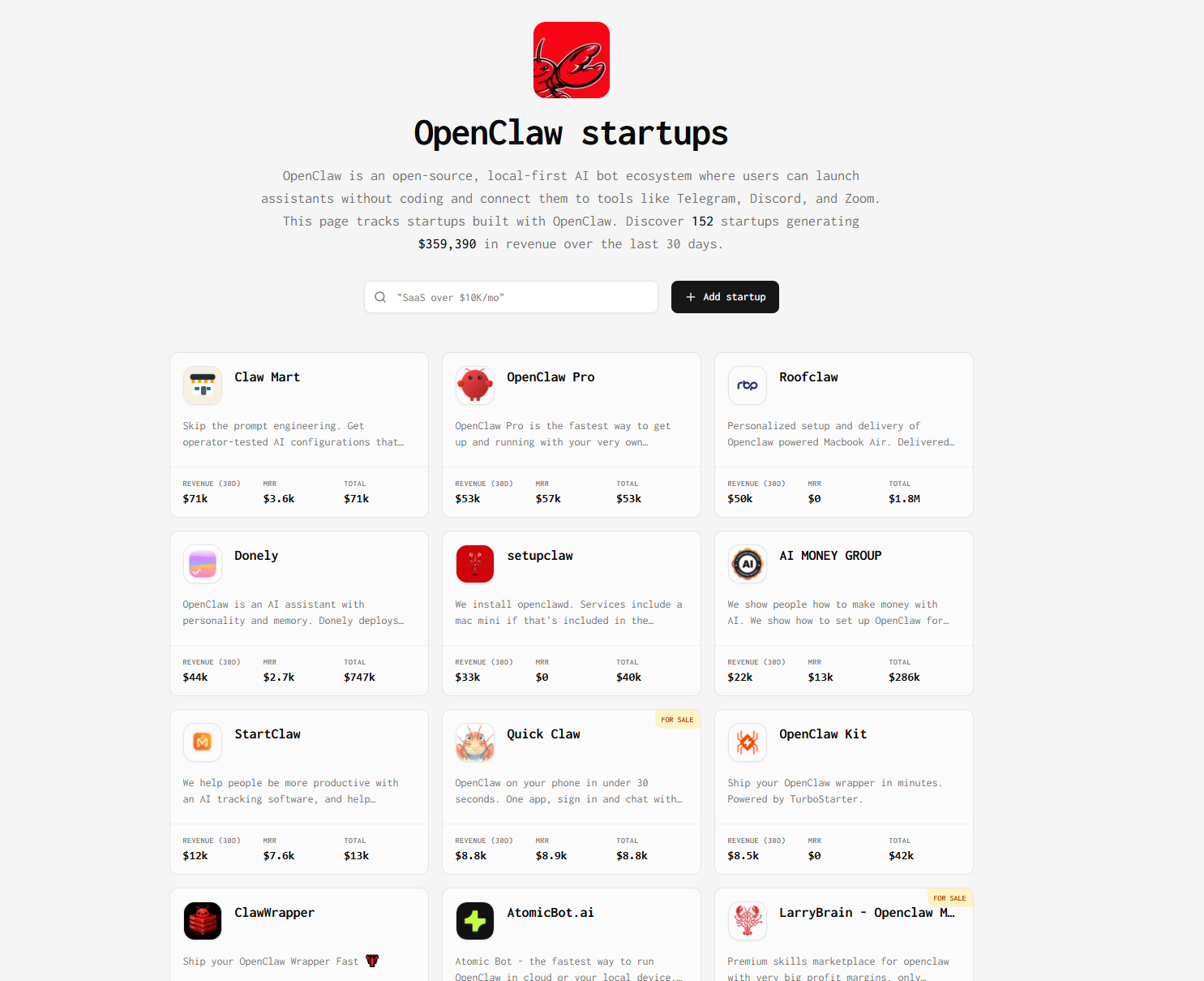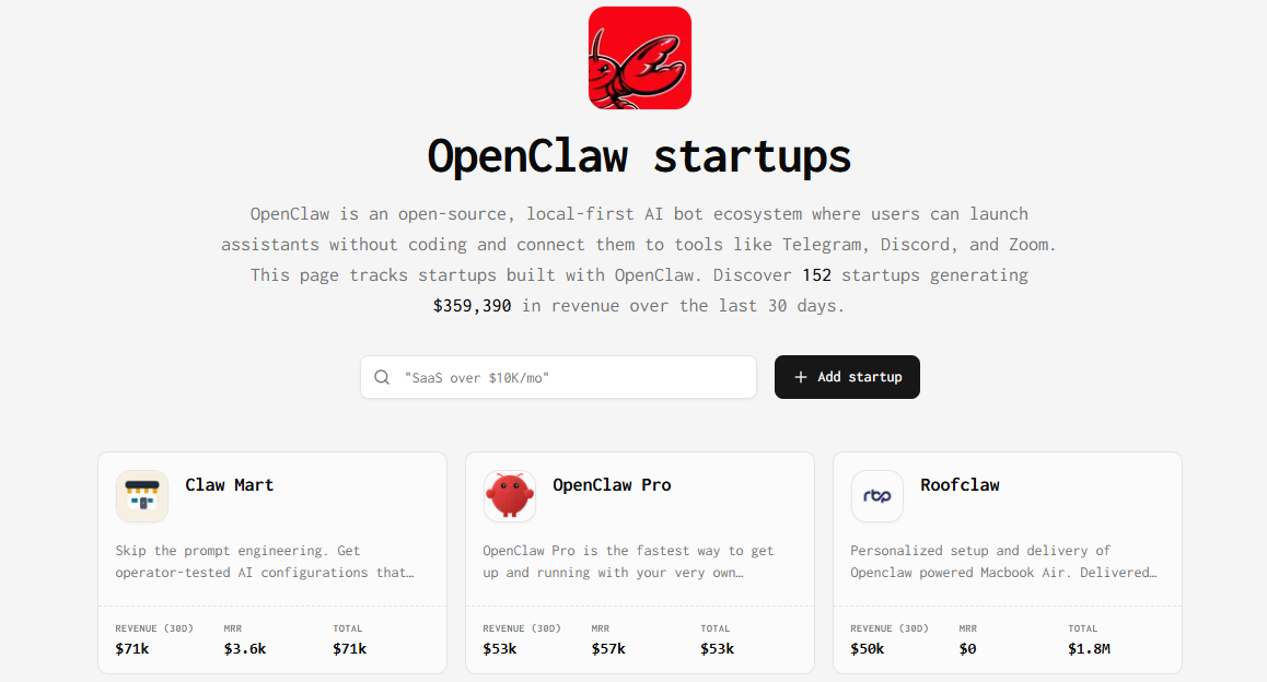 海外创业公司数据平台TrustMRR的OpenClaw分类页显示,该生态下共有153个记录在案的项目,近30天合计收入约35.86万美元。进一步提取排名前30的样本,其合计收入占总收入的97.3%。如果我们将这些项目及其背后的赚钱逻辑按“产业价值链”逐层拆开,会发现一个扎心的真相:最先赚到钱的,并不是那些用龙虾做产品的人,而是帮别人把龙虾养起来、教别人怎么养龙虾的人。
