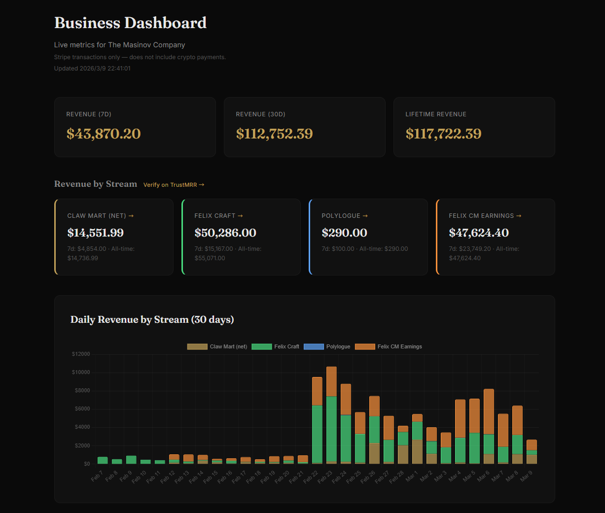 值得一提的是,在TrustMRR的OpenClaw分类当中收入排名第一的项目Claw Mart(一个Agent Skill市场)正是由Felix这个Agent创建的项目,目前的累计收益已达到7.13万美元。而这个项目之所以能够实现这么高的收益,还有一个重要的原因是,Felix作为一个Agent能自主实现创建项目及自动化工作的故事本身就是这个产品的最强背书。