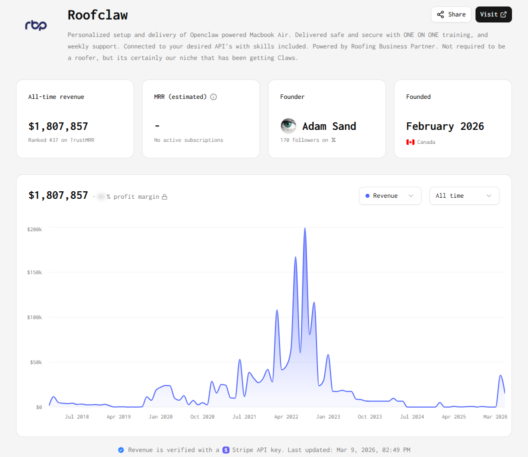 RoofClaw是这类项目的典型代表。TrustMRR显示,它近30天收入约4.98万美元,累计收益达到了180万美元。它定位为“性化定制并交付搭载 Openclaw 系统的 MacBook Air”,也就是说,他的业务思路并不是简单的帮你预装一个“小龙虾”,而是将这个小龙虾封装在一个MacBook当中,同时附带定制化服务,帮你把这个“龙虾”调教成符合你需求的Agent。