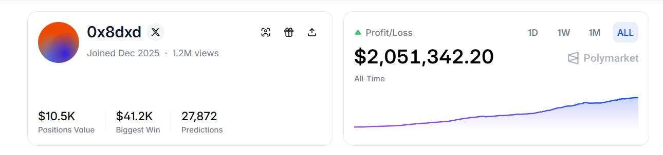 目前少数可通过链上数据查证的,是预测市场Polymarket上的账户0x8dxd,该账户是一个预测市场高频交易机器人。社交媒体上出现了大量帖子推测其底层依托了OpenClaw实现了高频交易的故事,但从PANews的分析来看,这个高频地址背后的实控人从未发表过类似的内容,这些所谓的“Openclaw帮我设计了一套自动化交易的程序然后月入十万美元”的故事都是流量软文,大多数是为了吸引人采用他们的跟单bot。