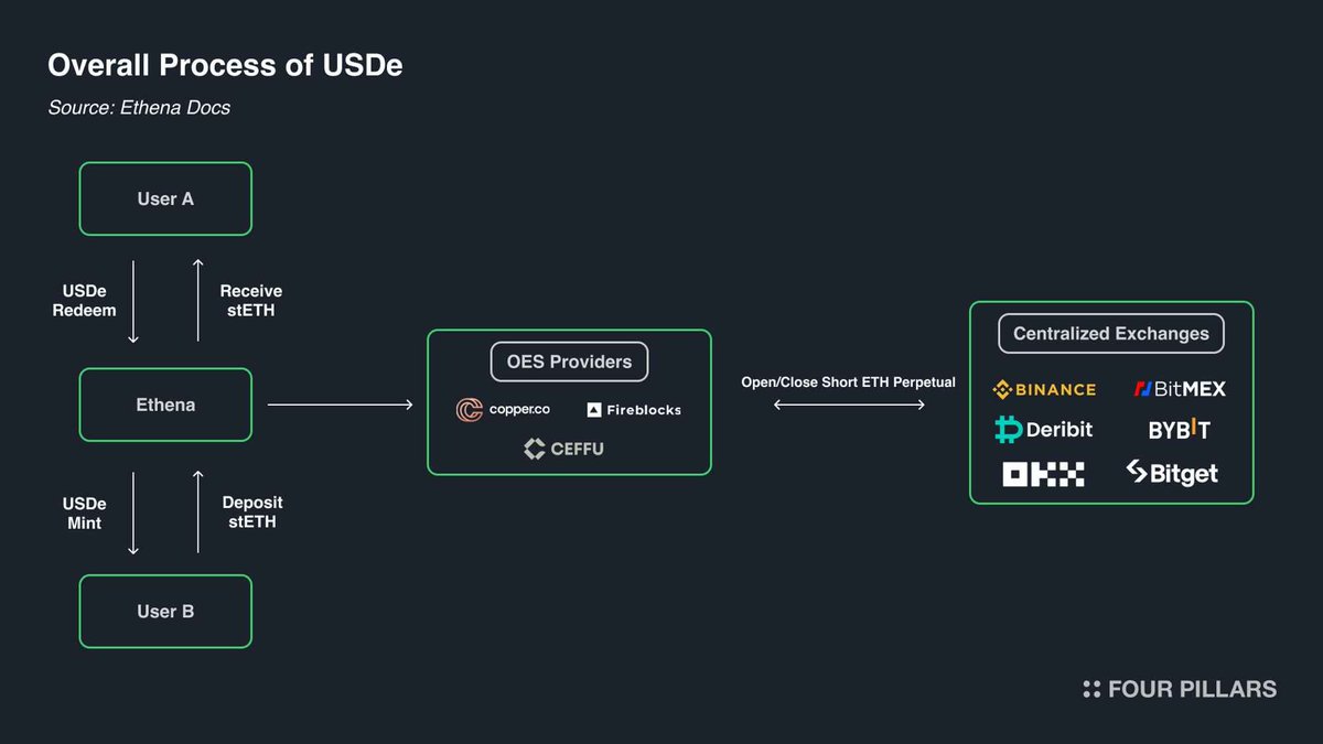 Ethena 为我们提供了一个极其独特的视角,让我们得以深入了解加密货币衍生品市场。如下图所示,Ethena 实现了加密货币套利交易。该策略很简单:当加密货币交易者做多时,Ethena 会作为其交易对手方做空。Ethena 会确保买入与交易者做空数量完全相同的资产。从某种意义上说,Ethena 提供的是一种杠杆服务。交易者希望从加密货币上涨中获利,但缺乏资金;而 Ethena 拥有资金,但风险承受能力有限。因此,交易者利用永续合约,以基差加上永续合约的融资成本,从 Ethena 借入资金。