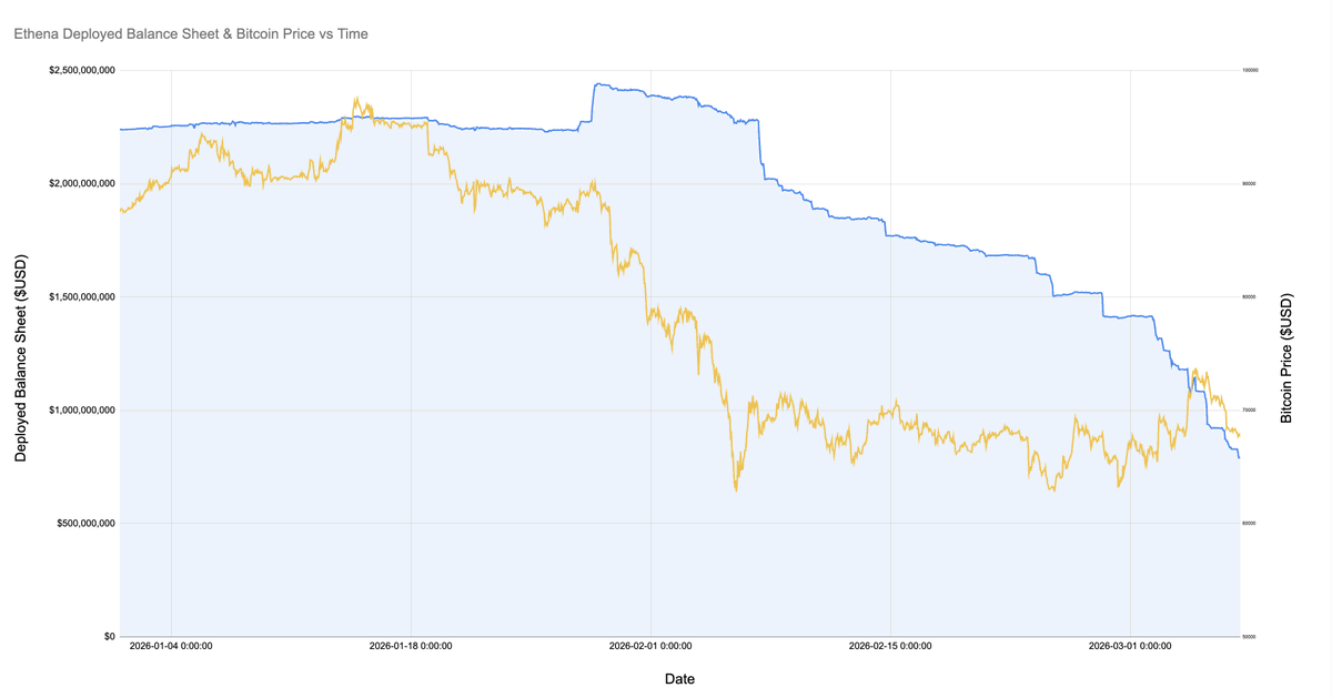 特别值得注意的是,在比特币价格暴跌至 6 万美元的市场崩盘期间,Ethena 部署了超过 20 亿美元的资金。自仅仅一个月前的 2026 年 2 月 8 日以来,Ethena 的已部署资本已惊人地下降了 60%!