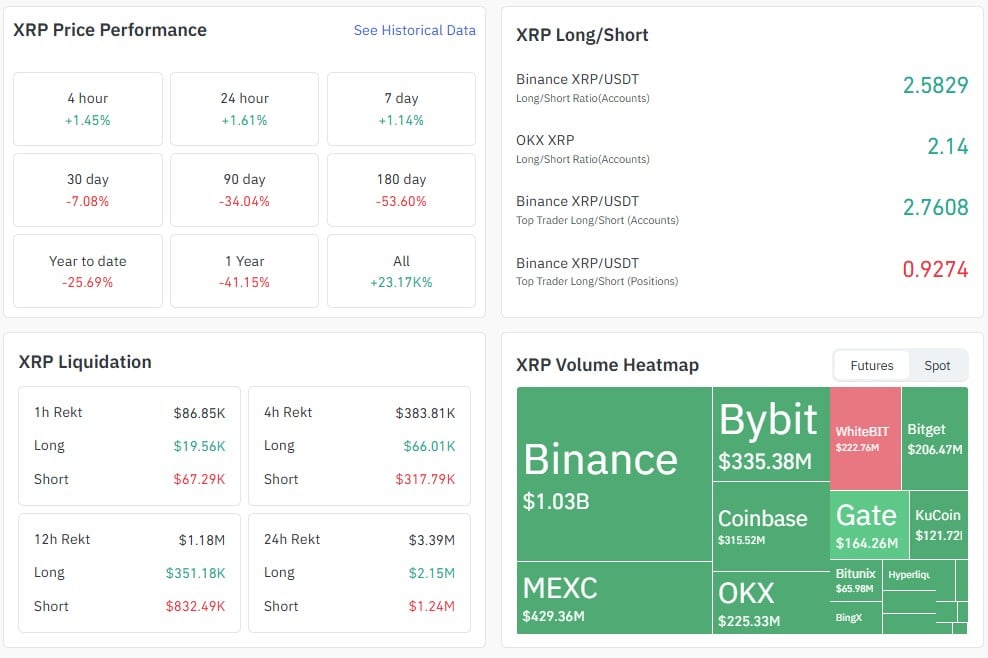 技术图景也反映在市场情绪中。尽管整体趋势仍然消极,但交易者似乎不愿意承诺进攻性的多头头寸。因此,XRP目前被困在一个仅比最近的局部低点略高的窄整合区间内。