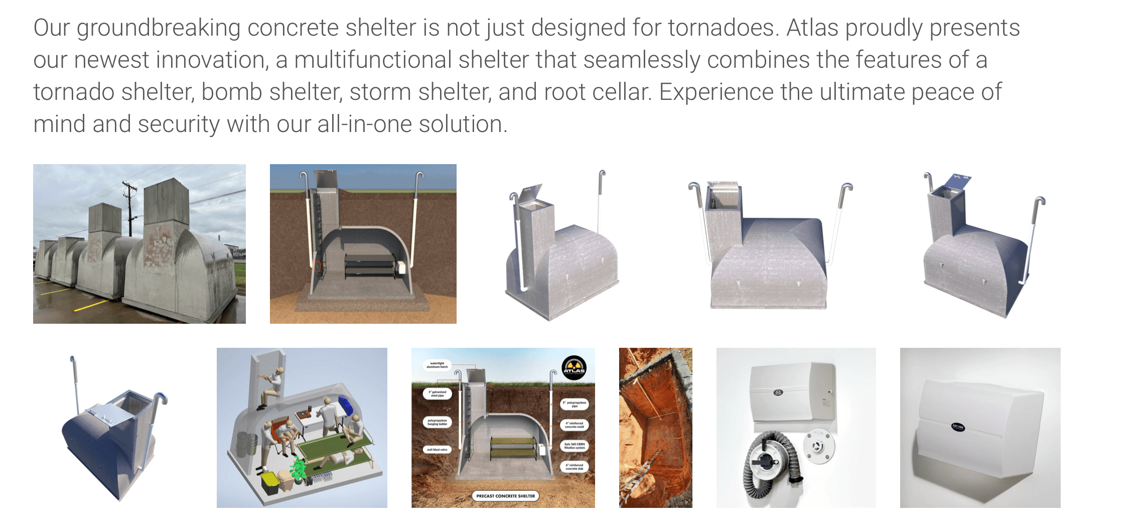 阿特拉斯出售各种庇护所,从约20,000美元到25,000美元的入门级后院模型到超过500万美元的大型奢华设施。基本单元类似于为应对风暴或短期紧急情况而设计的加固安全屋,而高端模型则旨在接近地下舒适。
