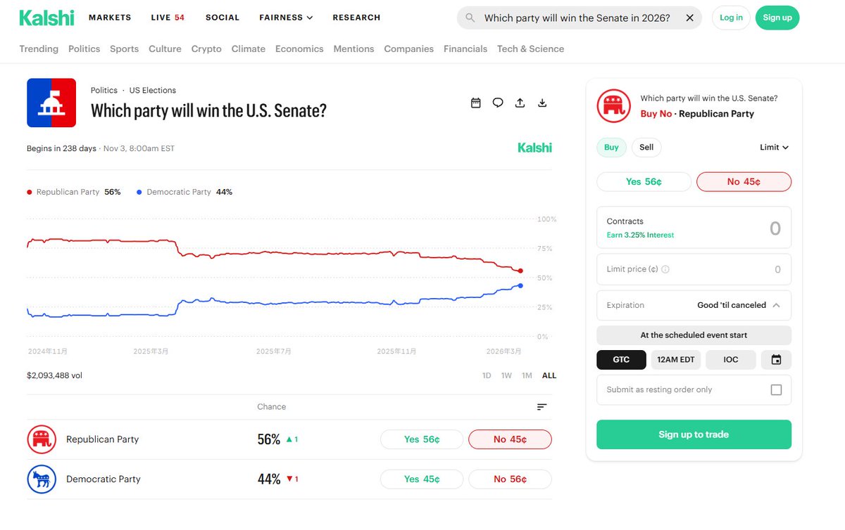 Kalshi 是 共和党 56 民主党 44 (45)
