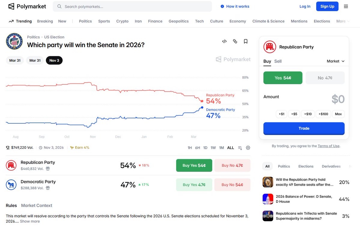 Polymarket 是 共和党 54 民主党 47