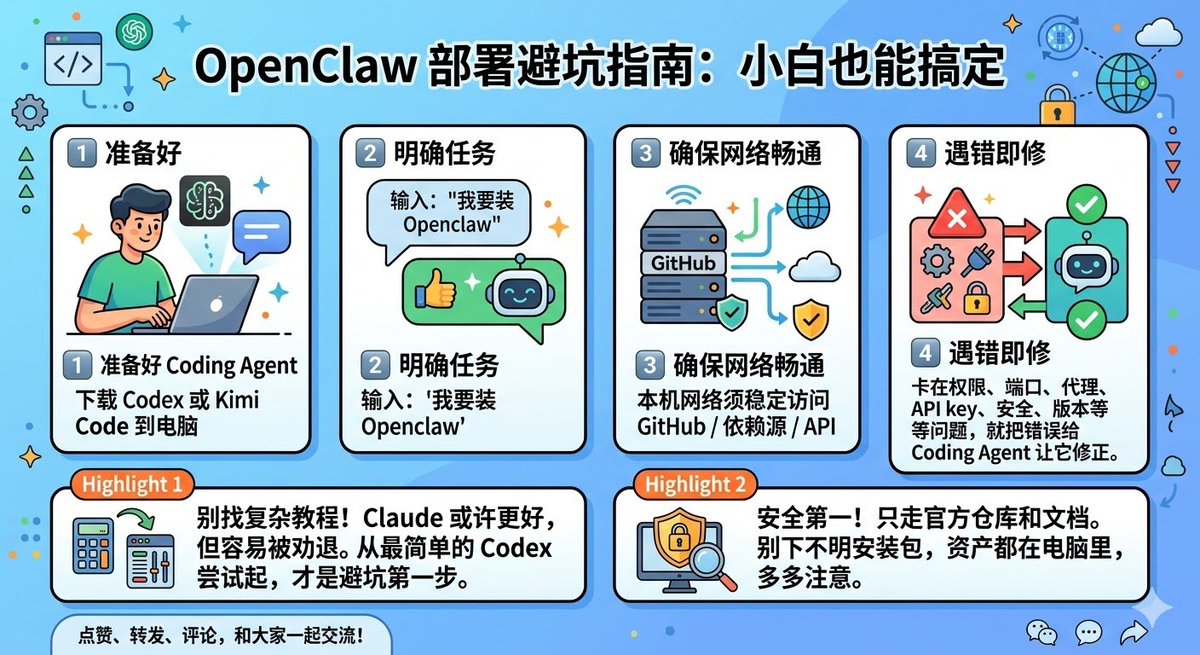 一般情况都可以直接安装成功,如果没成功,一旦卡在权限、端口占用、代理、API key、系统安全设置、Docker/Node 版本冲突这些地方,就把错误给 codex 让他帮你修正。