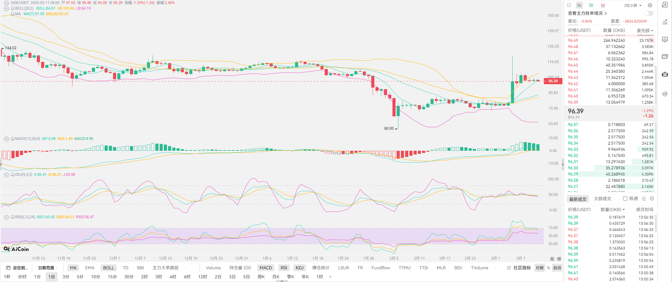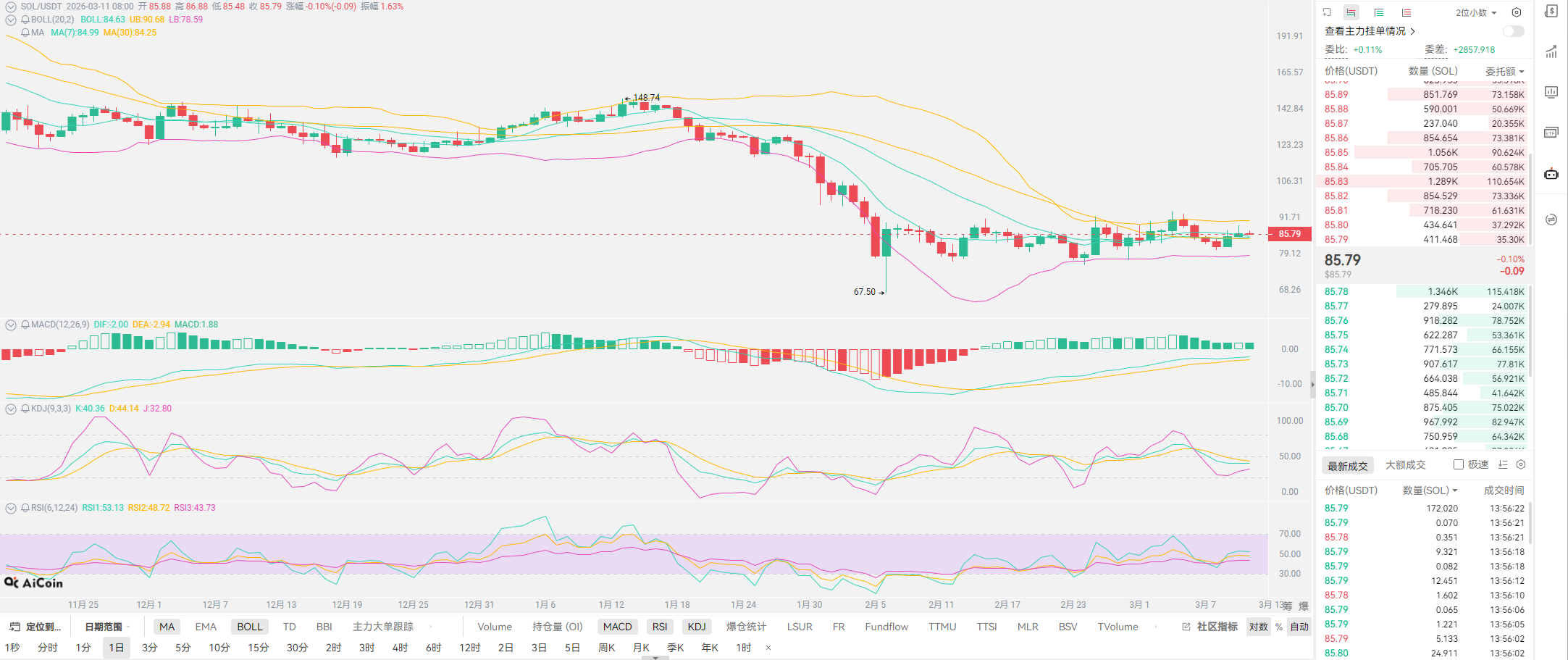 经过一天的波动,整个三月十日,高位位于71777,低位位于68391,一天的时间都是在跟七万关键点位做争夺。波幅虽然不大,仅仅维持在3000点左右。以太的波幅就更小2088-1990,居然不足百点。相信各位也能看出,以太的压制位置,与比特币完全不同,以太的争夺更多是位于2100位置开启。而近期最稳的币种,居然是OKB,95-100点附近的徘徊。所有币种的波动无疑,都在诉说着单边行情的结束,与我们前期预测基本相同,也都是处于一个震荡上行的态势。通过图形中的月线是有一个明显的企稳信号,单边下行的态势维持了将近五根月线,加上本月恰逢半年时间,极度契合半年的周期波动性,亦是老崔去年所提,下行区间不会超过半年。