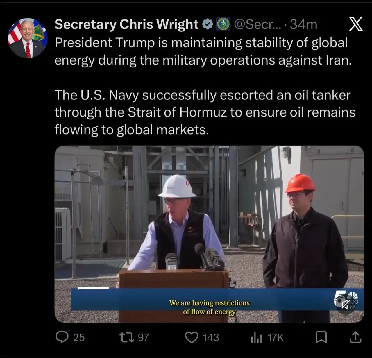 美国能源部长 Chris Wright 在 X 平台上发文称:「美国海军已经成功护送一艘油轮穿过霍尔木兹海峡,以确保石油继续流向全球市场。」