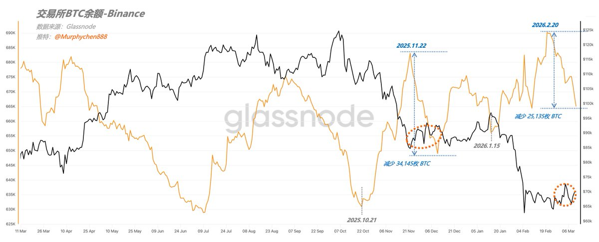 这和当前的走势如出一辙,从2026.2.20至今Binance的BTC余额减少 25,135枚 BTC,而这段时间恰逢美伊军事冲突,而BTC价格整体上仍维持震荡,即没有大跌也没大涨。