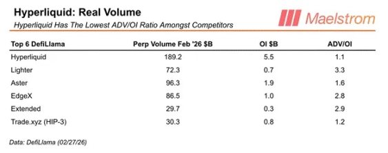 在头部 5 家永续合约 DEX 中,Hyperliquid 的交易量最真实,因为它的 ADV/OI 比率最低。当交易者意识到竞争对手平台的流动性很多是虚假的,或者积分 / 代币挖矿已经结束,他们就会回流 Hyperliquid。