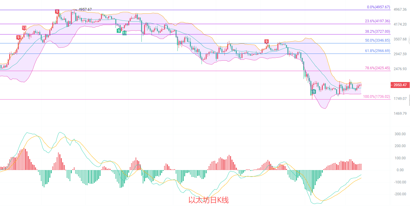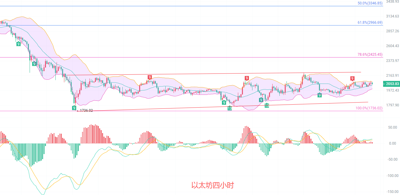 四小时K线依旧在趋势指标一线横盘,趋势支撑在2020到1988一线,MACD连续放量,DIF和DEA在高点收缩扩散,量能在2000上方释放,布林带上轨阻力点2085,做交易有一句话相信大家听过,压力位久守必失,回调就是北上的机会已经上车的不要急着清仓,要留底仓防止错失良机