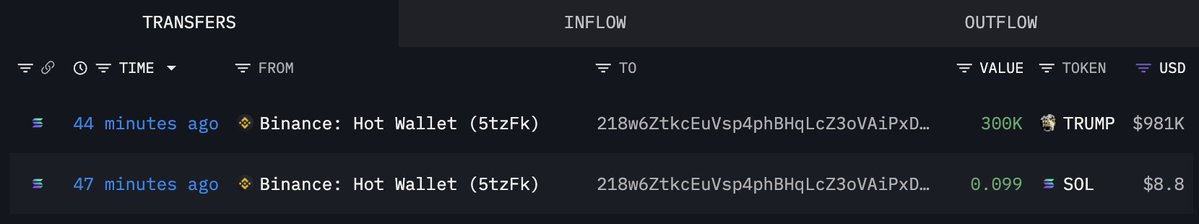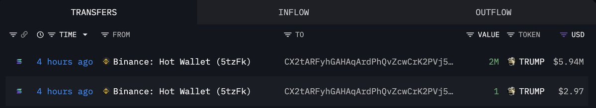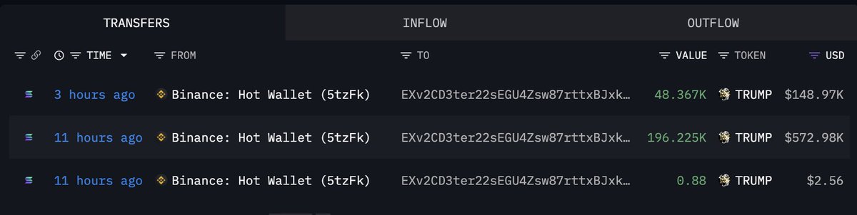 3 个新创建的钱包在过去 12 小时内从 #Binance 提取了 254 万 $TRUMP(880 万美元)。