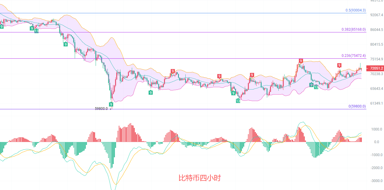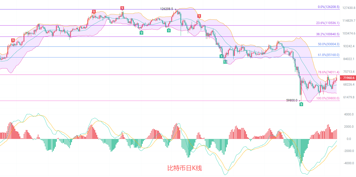 日K线发稿前可以很明显的看到高点在73850,说明主力在准备冲击前高74000也就是黄金分割线0.786阻力位,尤其是连续五天收阳线以后站稳EMA30趋势线7万关口发力北上,MACD连续四日放量增筹,DIF和DEA来到了0轴线附近,若行情破前高74000,那么0轴线失守北上再次开口,布林带上轨72600已经失守,整体趋势上北上不可避免