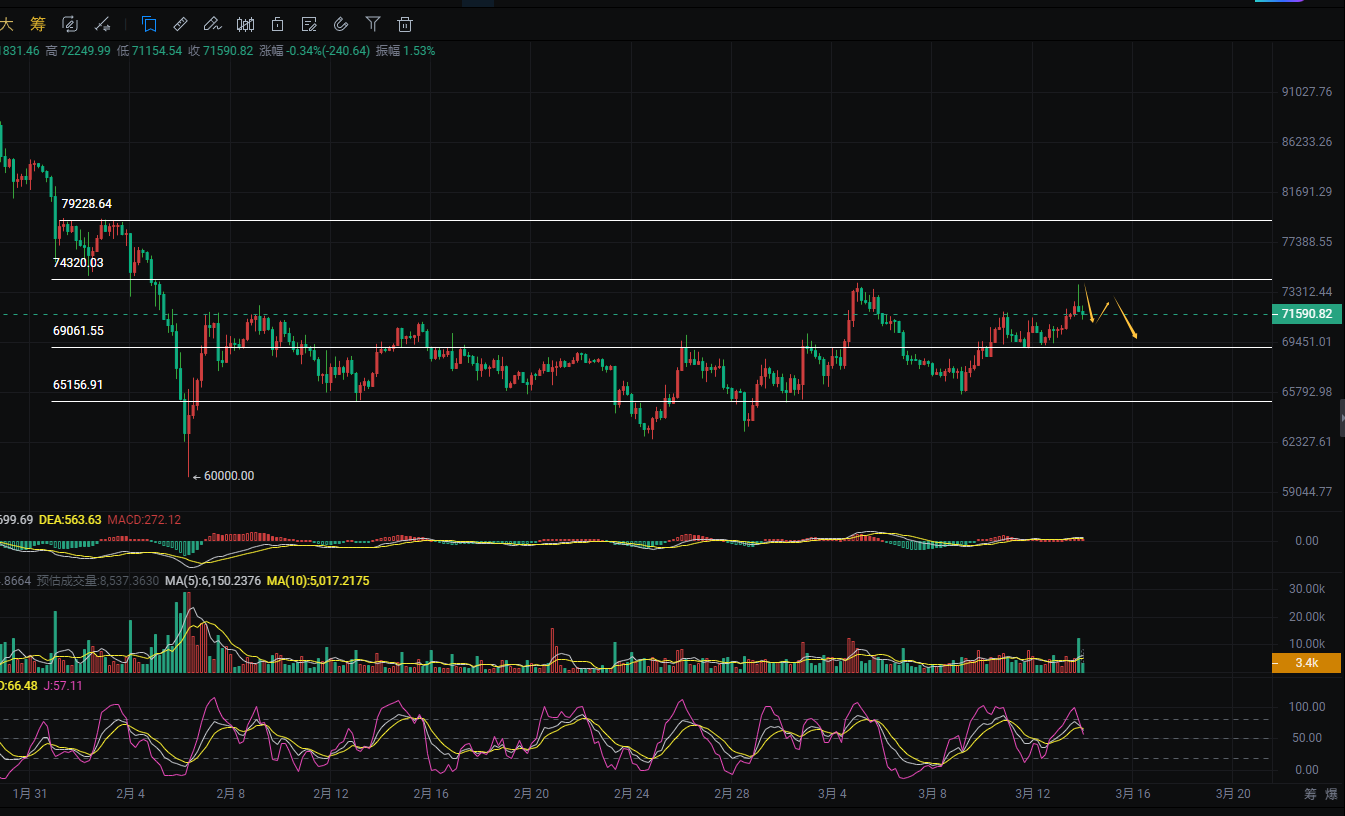 币圈院士:3.14比特币开启北上通道,前高74000冲刺倒计时!最新行情分析及思路参考