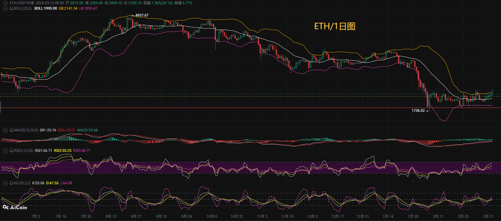 再来看看以太坊的走势。今天以太坊的表现可以说是比较亮眼,日内延续了一波反弹。行情直接向上突破了,成功突破了前高一直压制的2200美元高位区域。虽然最高触及2210美元后,出现了一波回调,现在价格回到2100美元附近运行,但这波超过百点的拉升,已经完全扭转了昨天那种弱势震荡的局面。