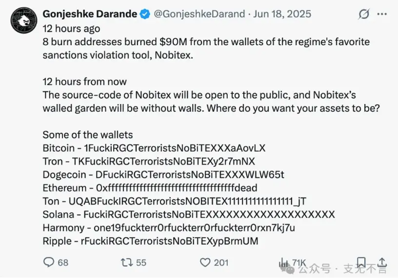 他们把这整整9000万美元,转入了8个"黑洞地址"销毁。这些没有私钥的钱包,一经打入,资金将永远无法取出。讽刺的是,这些地址还统统嵌入了类似“FuckIRGCTerrorists”的字样,IRGC正是伊朗革命卫队的缩写。
