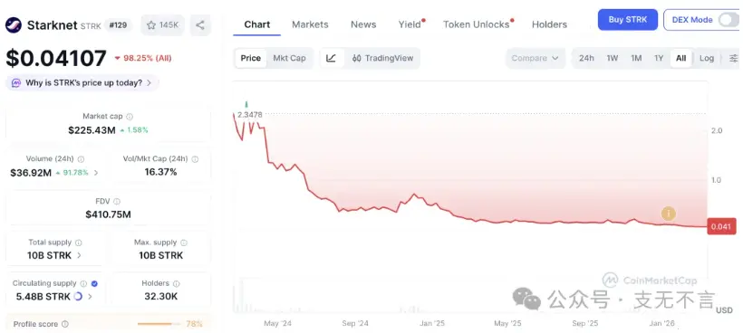 此次对伊朗发动打击的死对头以色列,在加密世界里扮演的角色更为高冷。这个国家没有廉价电力,也不需要用加密绕过制裁,但它有全球密度最高的区块链创业公司。零知识证明领域的多个核心项目出自以色列团队,StarkWare 在 2025 年估值达到 80 亿美元。尽管它的代币 STRK 上线后跌去了九成,成了天亡级项目的代表,生态至今也没什么人用。