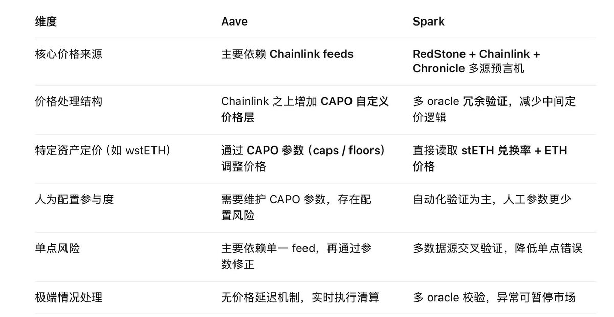 对于像 wstETH 这种资产,Spark 甚至不去额外设计价格逻辑,而是直接读取 stETH 的兑换率,再结合 ETH 价格,尽量让价格回到资产自身。