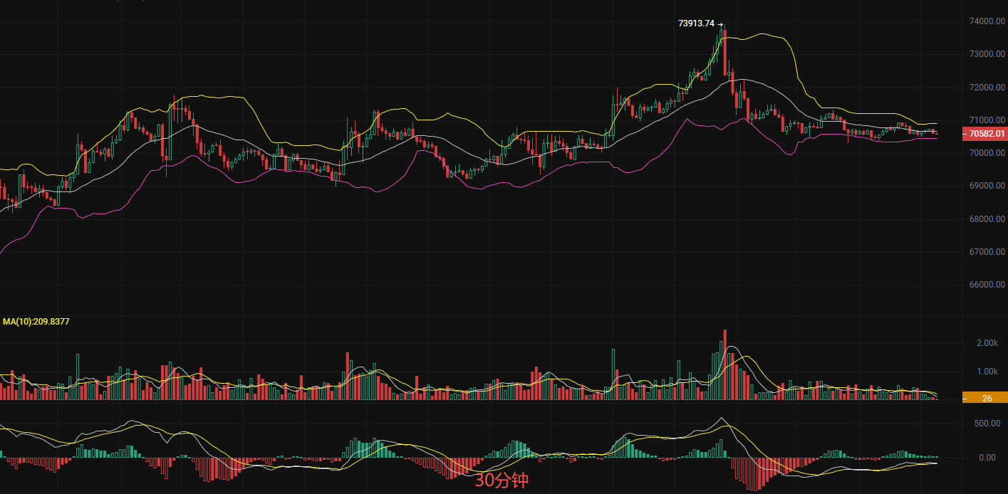 做多思路:若行情站稳上轨72620开多,第一目标看74000前高,挑战75000,第二目标看布林带上轨延伸76000到77000,止损放在布林带中规,若中规失守则止损