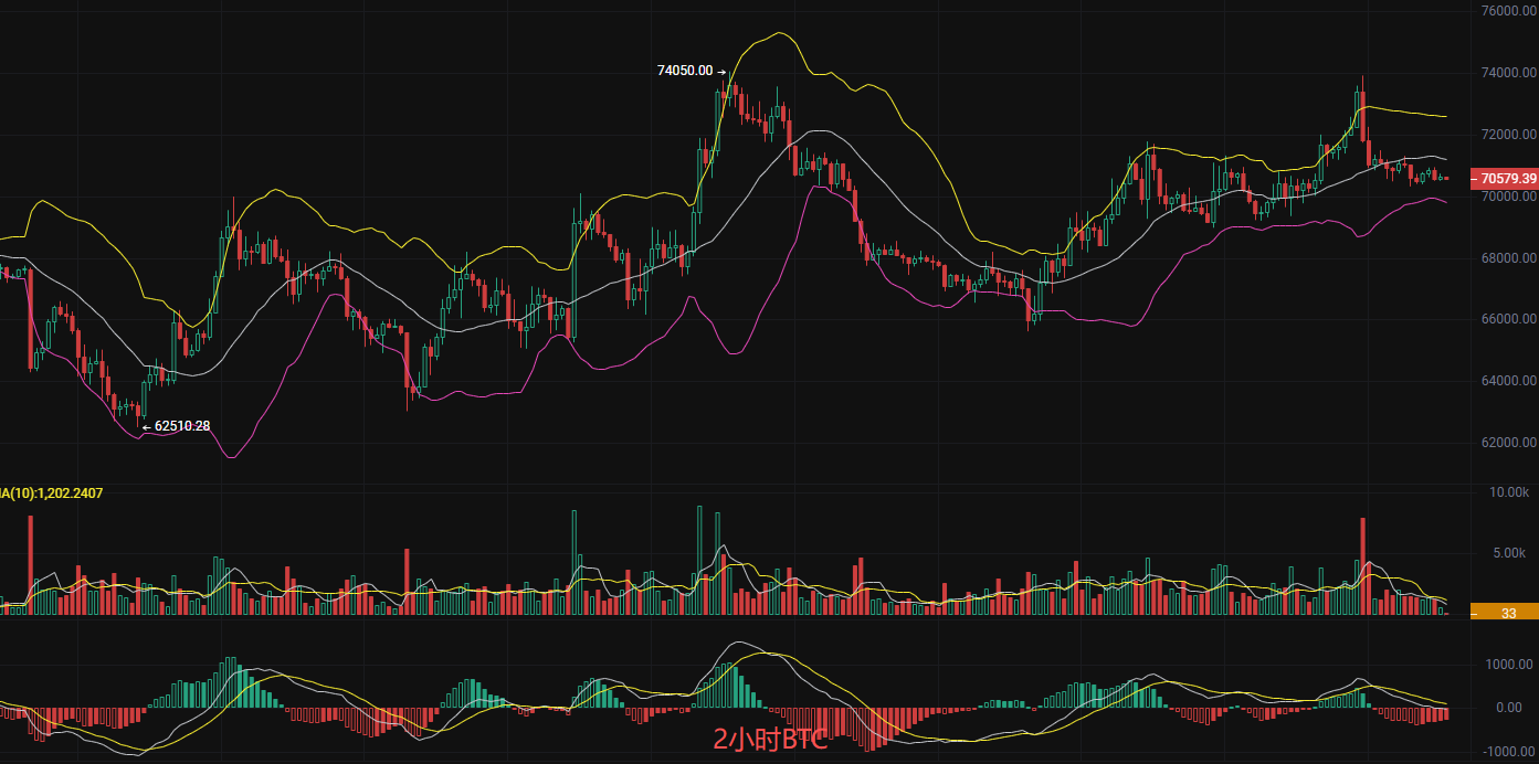 布林带波动率收缩,变盘窗口临近当前状态2小时窄幅收敛形态上轨72619.、中轨71255、下轨69892间距大幅缩小,说明短期多空博弈进入胶着期,波动率降至低位。历史规律布林带收窄后,往往伴随突破式行情向上或向下。当前机会当下布林带再次收窄,若价格向上突破上轨72619则大概率开启新一轮上涨;若向下跌破下轨69892则可能延续回调。
