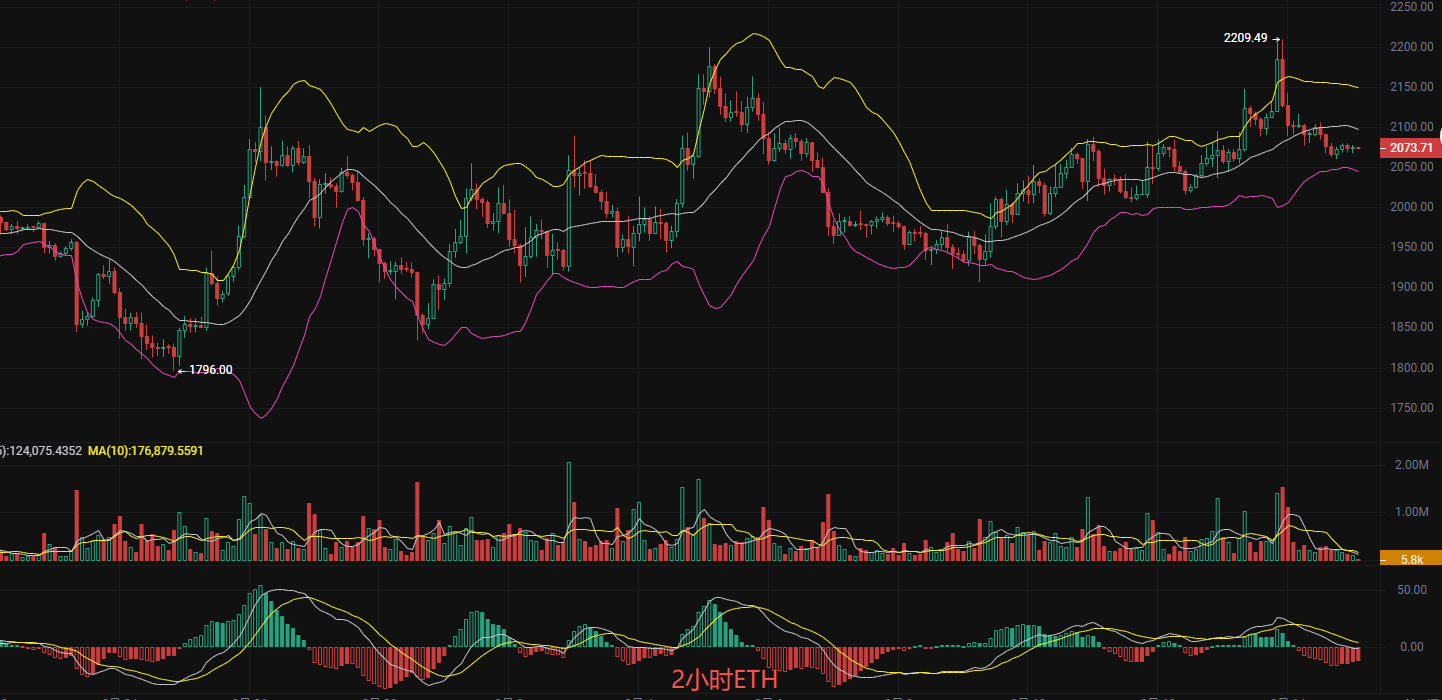 各位币圈战友们好,我是丽盈!现在我们一起来看ETH2小时K线图,从布林带、MACD、成交量三维度拆解隐藏的多空博弈密码,在缩量震荡+底背离信号,是下跌尾声的抄底机会,还是下跌中继的诱多陷阱?看完这篇,你会找到答案!