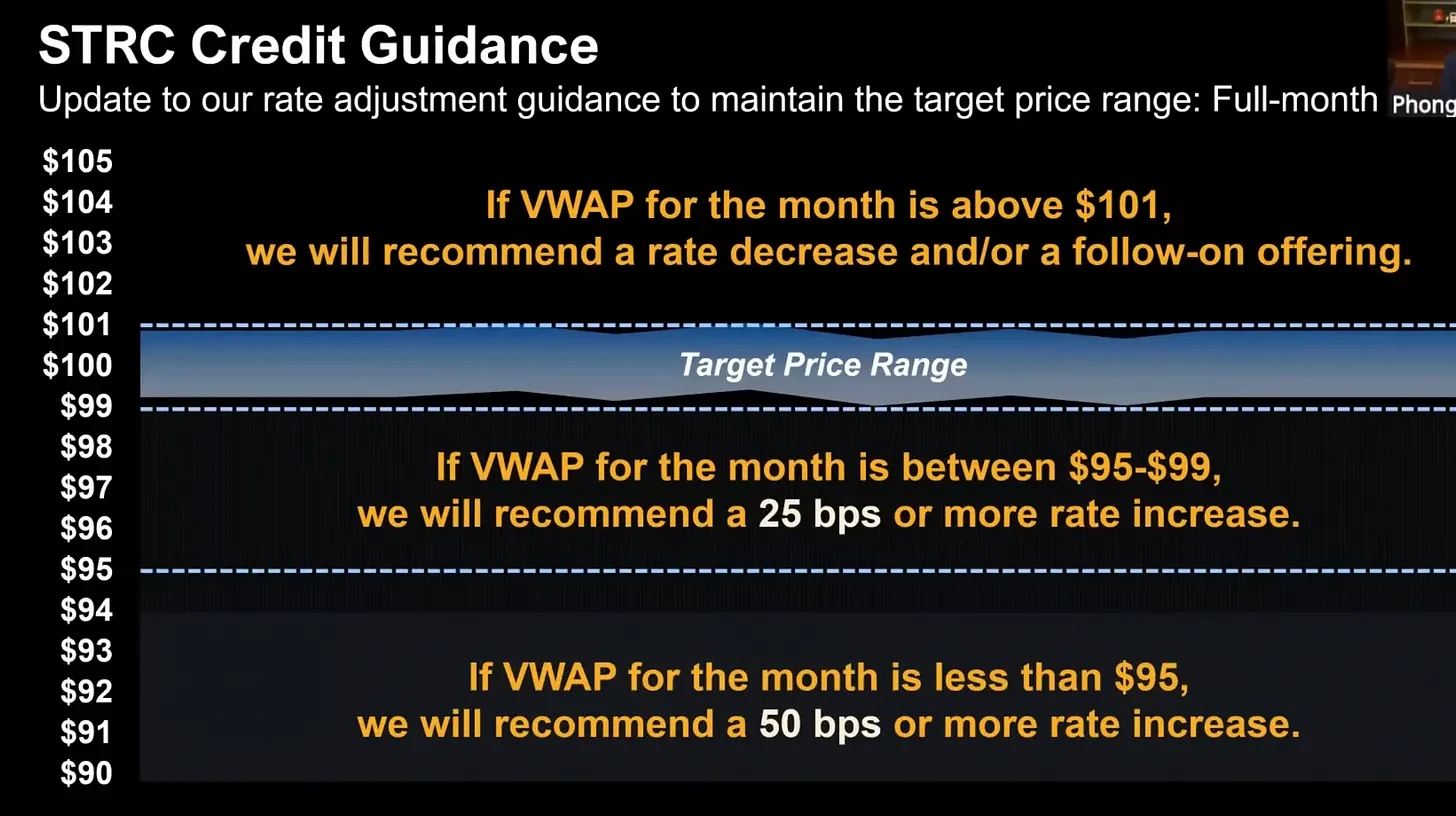 Strategy 目前给出的指导原则是:如果 STRC 的月度 VWAP(成交量加权平均价)在 95–99 美元之间,他们将提高 25 个基点(bps)的股息率;如果月度 VWAP 低于 95 美元,他们将提高 50 个基点;如果 月度 VWAP 高于 101 美元,他们则会降低股息率。