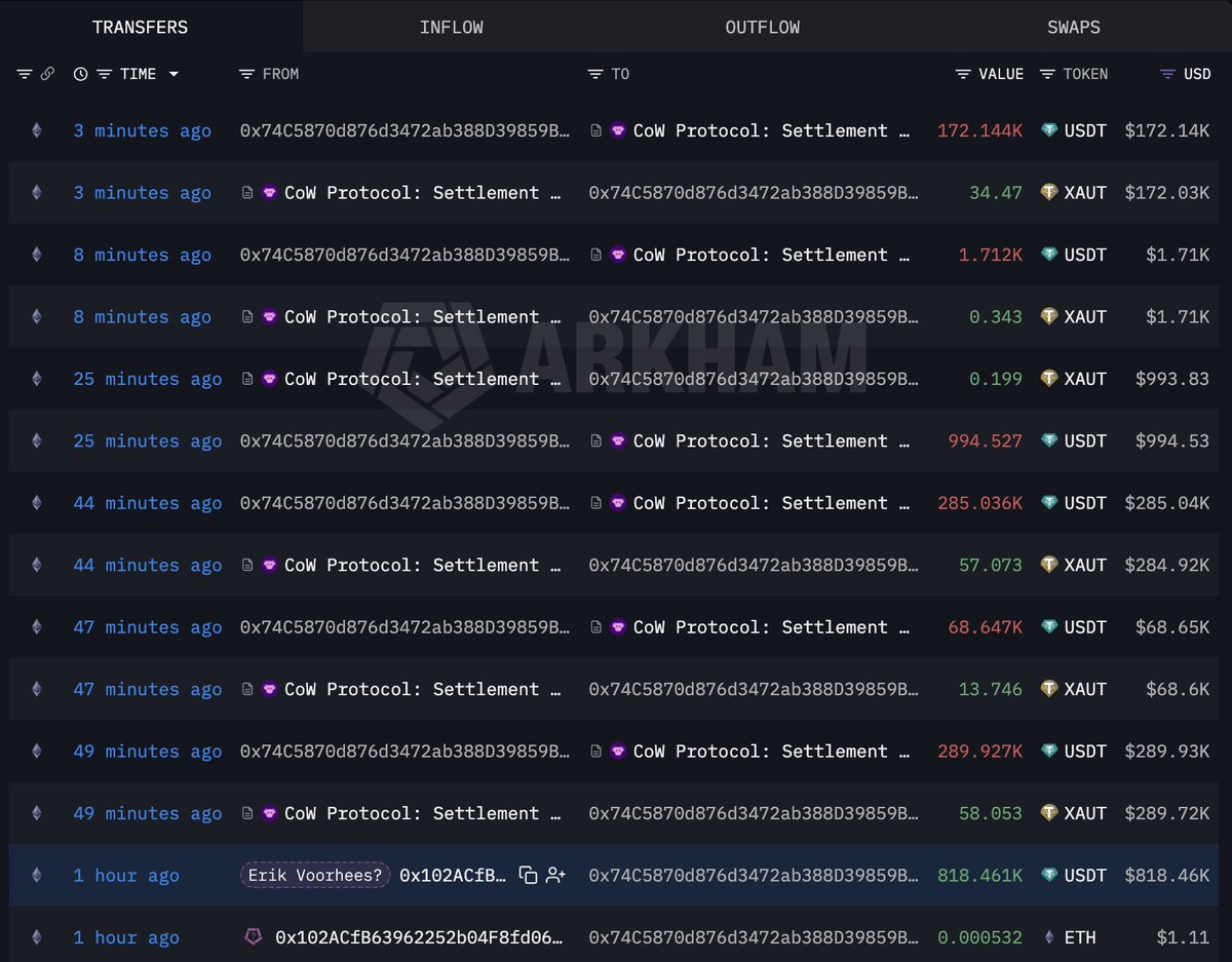 自1月31日起,他创建了28个新钱包,花费2376万美元购买了2834个$XAUT(1378万美元)和2019个$PAXG(997万美元),平均价格为4896美元。