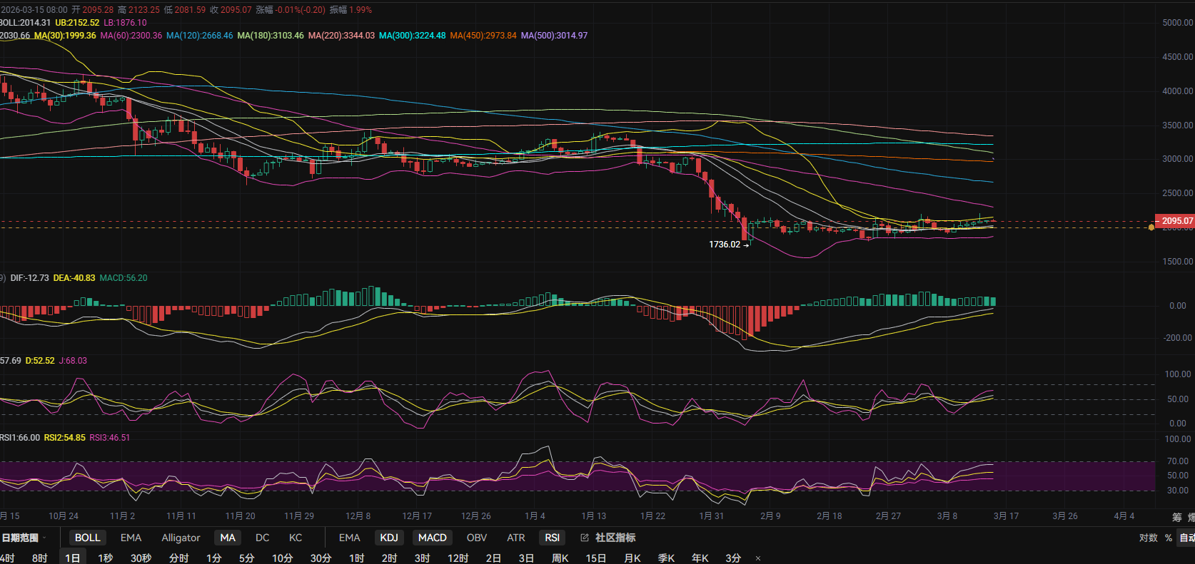 日线上多头格局没有太大改变,行情依旧处于中轨上方靠近上轨位置,中轨与MA15,MA30三线重合形成2000关口支撑的重要屏障,MACD中0轴上方放量没有出现明显缩量变化,快慢线也是保持开口向上格局,KDJ三线继续保持上行接近70,说明上方空间还是存在,整体思路可以保持继续低多介入为主!