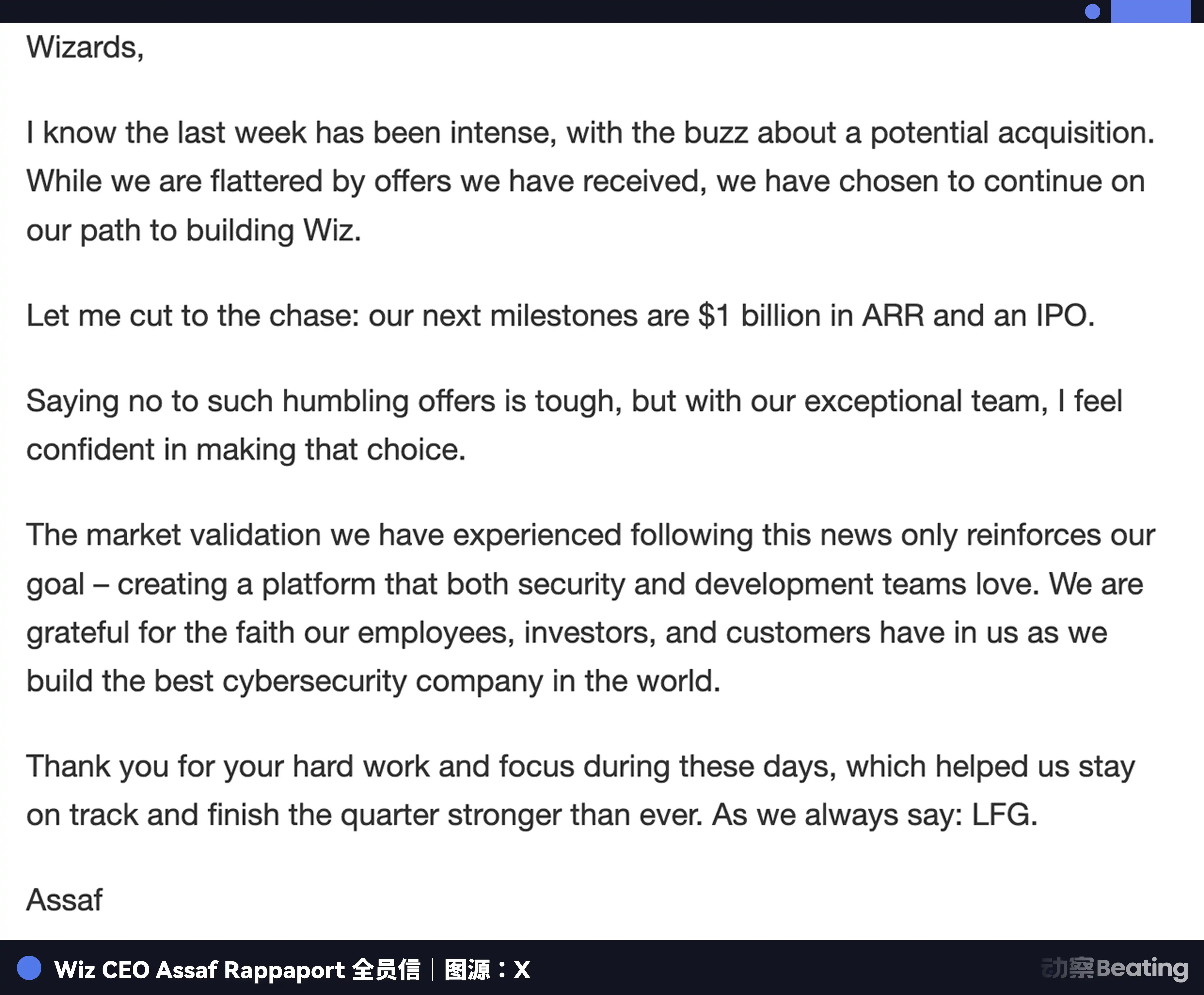 「我知道过去一周非常紧张,围绕潜在收购的传闻不断,虽然我们对收到的邀请感到受宠若惊,但我们选择继续打造 Wiz 的道路。」Wiz CEO Assaf Rappaport 在发给全员员工的邮件中说 Wiz 的下一个里程碑是 10 亿美元的年化收入和 IPO。