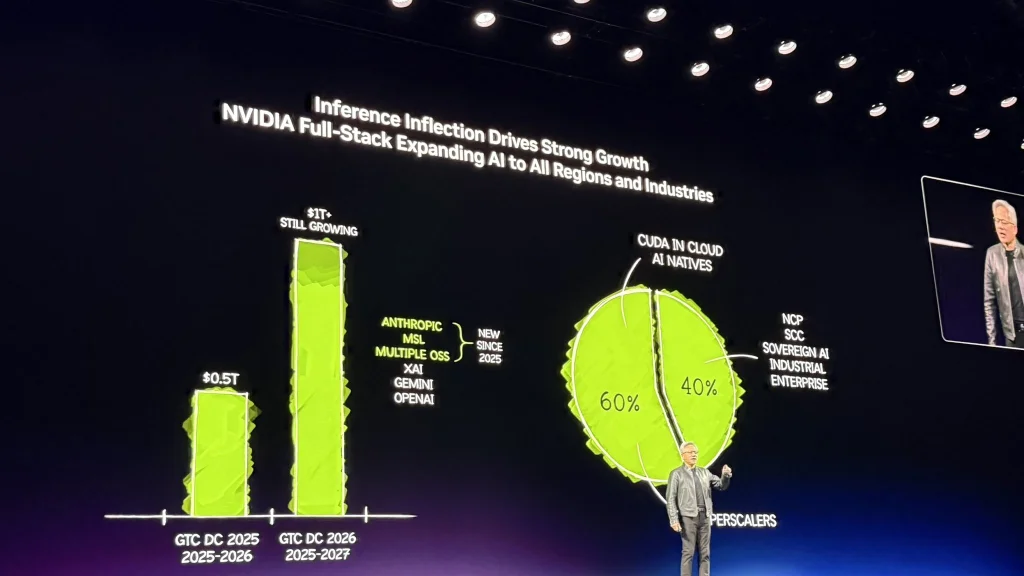 去年这个时候,我说过,我们看到了 5000 亿美元的高确信度需求,覆盖 Blackwell和 Rubin 直到 2026 年。现在,就在此时此地,我看到到 2027 年至少有 1 万亿美元的需求(at least $1 trillion)。