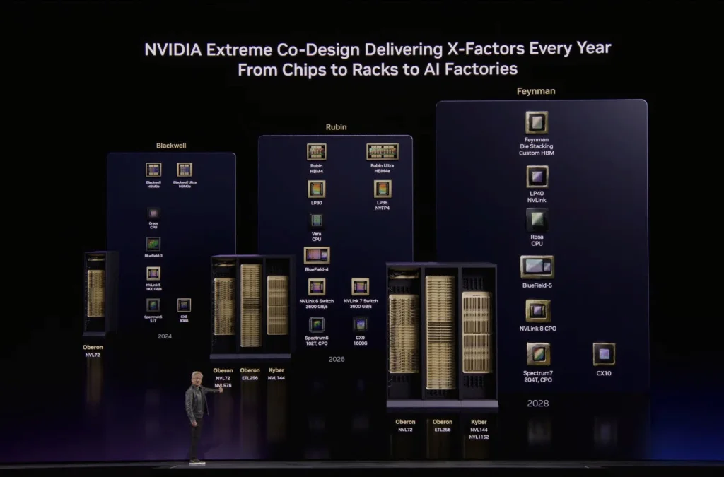演讲最后,黄仁勋还“剧透”了下一代计算架构 Feynman,它将首次实现铜线与 CPO 的共同水平扩展。更引人遐想的是,英伟达正在研发部署在太空的数据中心计算机“Vera Rubin Space-1”,彻底打开了 AI 算力向地球之外延伸的想象空间。
