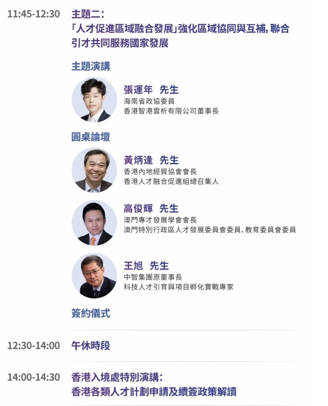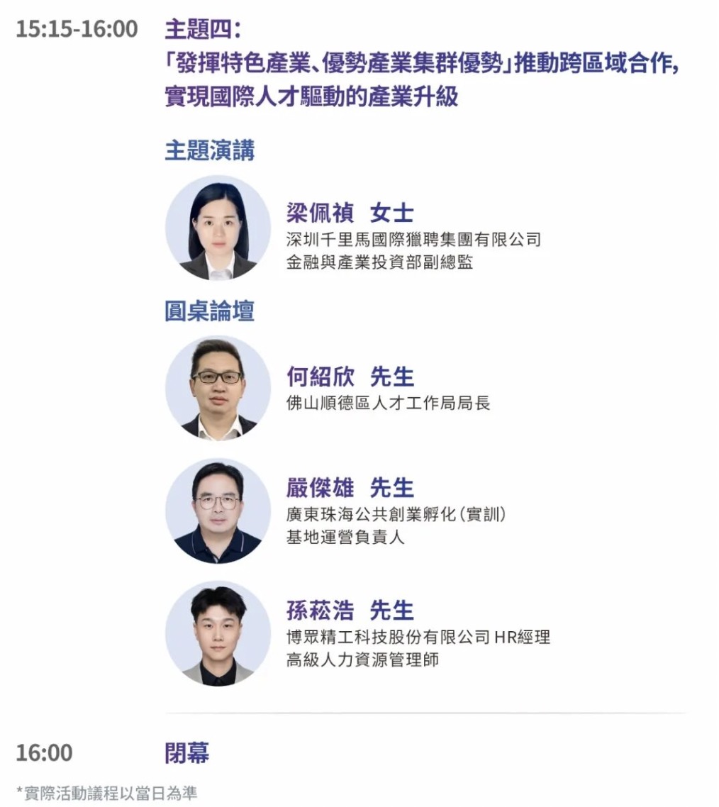 大会组委会精心设计四大主题演讲及圆桌论坛环节,与会嘉宾将剖析香港与内地合作的价值与机遇,分享对粤港澳大湾区深度融合发展、国际高端人才生态圈建设以及人才跨域合作赋能产业升级等重要议题的真知灼见。