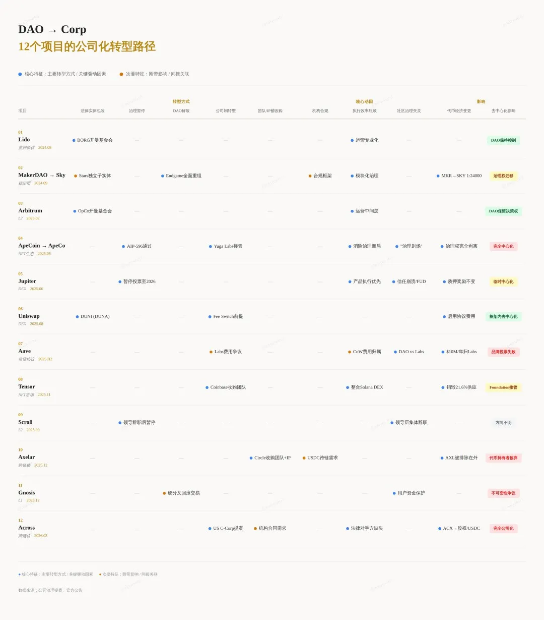 2026 年,Aave 开放团队和 DAO 内战不止,Across 甚至提案「倒带」回公司制,而代币要被战略性放弃,转换为普通股。