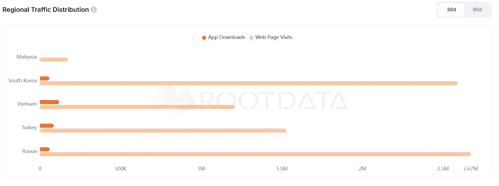 在流量层面,Binance 本月在俄罗斯、韩国等新兴市场表现最佳,两国总访问流量超过 527 万次,显著领先其他加密货币交易所。