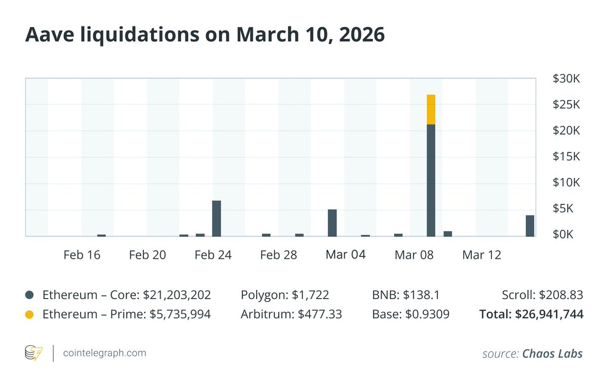 据风险监测机构 Chaos Labs 报告,2026 年 3 月 10 日的市场下行在 Aave 上引发了约 2700 万美元的借款人头寸清算,清晰地展示了这一脆弱性。在 24 小时内,价值约 2700 万美元的用户头寸被清算。令人意外的是,此次事件并非由大规模市场抛售引起,而是由于 wrapped staked ETH (wstETH) 抵押品出现了一个短暂的 2.85% 价格偏差。