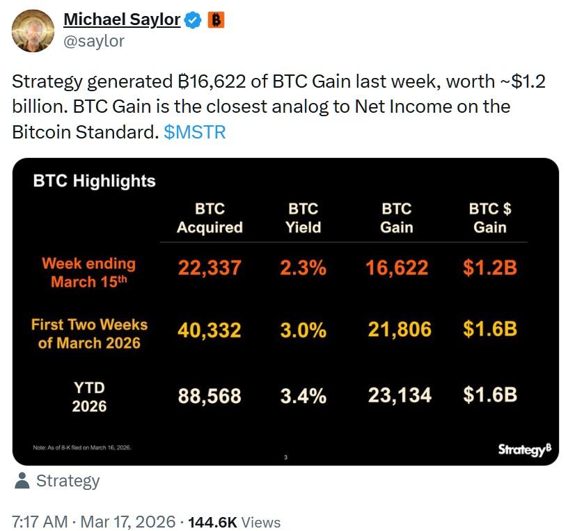 执行主席迈克尔·赛勒在社交媒体平台X上分享了这一更新。在截至3月15日的一周,策略公司报告获得了16,622个比特币,相当于基于当前市场价格约为12亿美元。该公司强调“比特币收益”作为一个关键内部指标,反映其比特币持有的价值在一定期间内的变化,并作为经济表现的替代指标,而不是GAAP净收入的替代。