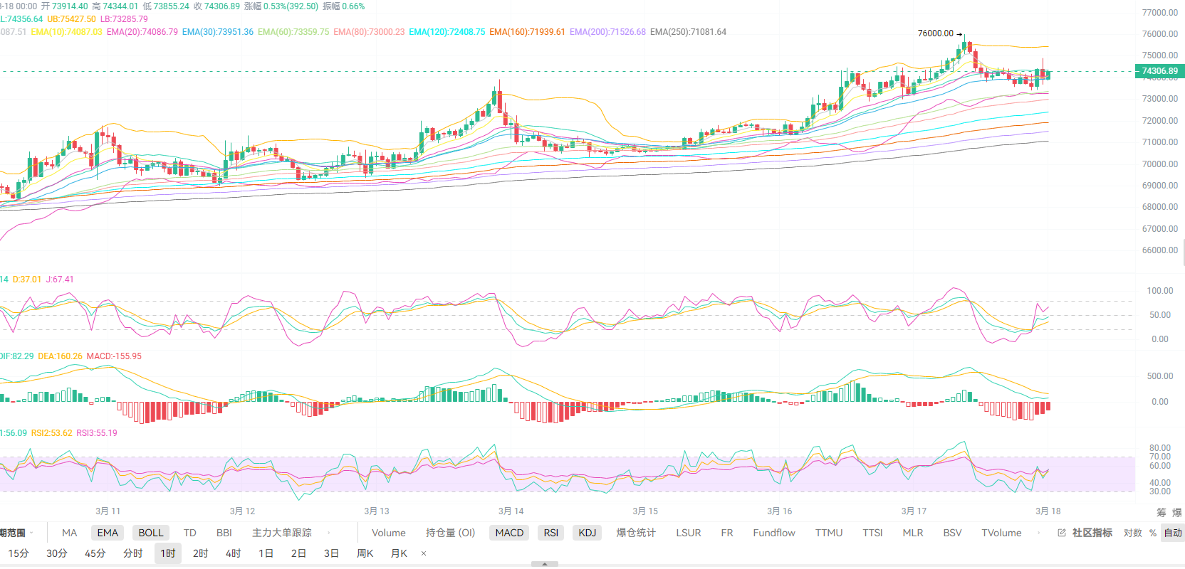比特币现价74300附近,日内行情直接冲高76000关口形成回踩,红姐再次精准布局高空点位并拿到1500点+收米,晚间k线在1H图中BOLL下轨与EMA60重合支撑位形成反弹,但没有突破上轨形成上影线十字星,这是一个看跌形态,MACD中红柱缩量减缓,DIF与DEA死叉后收口动能减弱,KDJ三线上攻无力向下拐头正在形成黏合,红姐认为短线下行空间还未走完;若k线二次下破EMA60位置及4H图中EMA10位置就可以看到EMA20与BOLL中轨区间,做多可以带好EMA30与EMA250区间防守!上方目标继续看1H图中BOLL上轨位置。