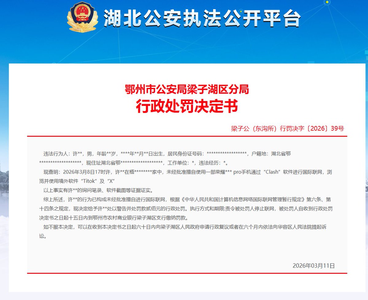 之前还有小伙伴质疑使用 VPN 是不是违法,刚刚看到了这个案例,就是 2026年03月11日 公布的行政处罚决定书,使用 Clash (翻墙)进行国际联网,浏览并使用境外软件 Titok 及 X 被视为违法,虽然处罚并不算严格,只是罚了 200 人民币。