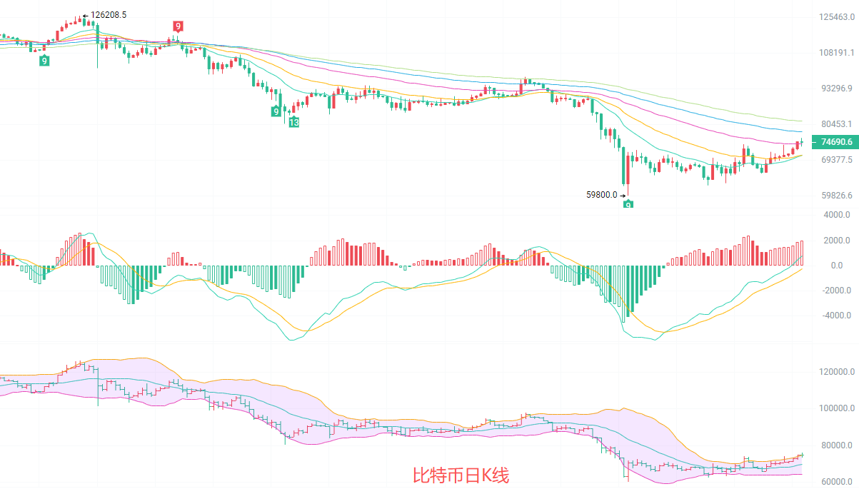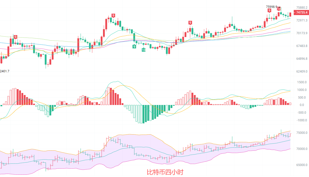 日线W 底成型,76000 关口近在眼前从 59800 触底后,走出了标准 W 底 加 上升通道,K线突破颈线 74000 后持续走高,底部结构扎实,确认牛市回调后的反转趋势,绝非短期脉冲行情,MACD 放量增筹,DIF和DEA 即将金叉突破 0 轴,多头动能持续释放;布林带开口向上,价格站稳上轨附近,南下空间被压缩,日线站稳EMA30巨鲸吸筹迹象明显,70000 关口已
