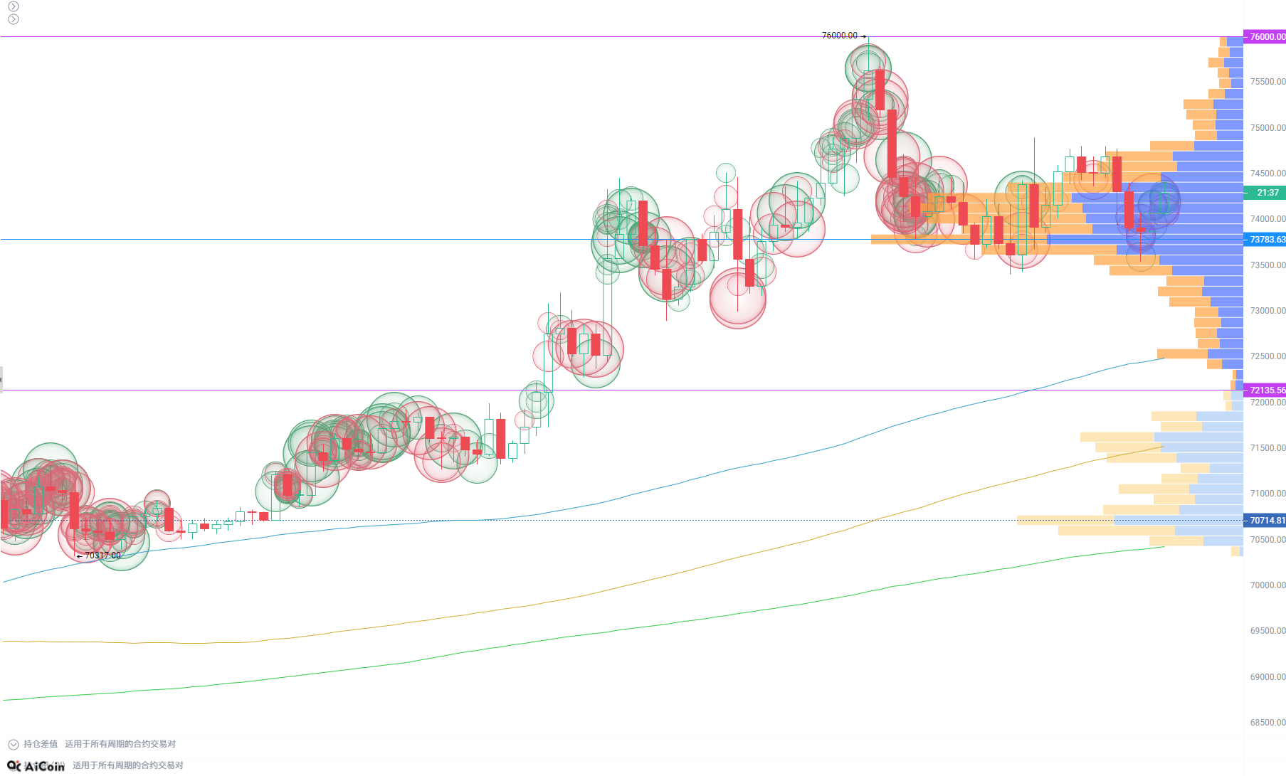 1. 持仓成本可视化: 类似于Strategy这种巨鲸,其持仓成本线往往是牛市中重要的支撑位或牛熊分界线。AiCoin的专业图表工具允许用户自定义添加“机构成本线”,当币价在75,696美元附近震荡时,系统会提醒投资者该价位的博弈意义。