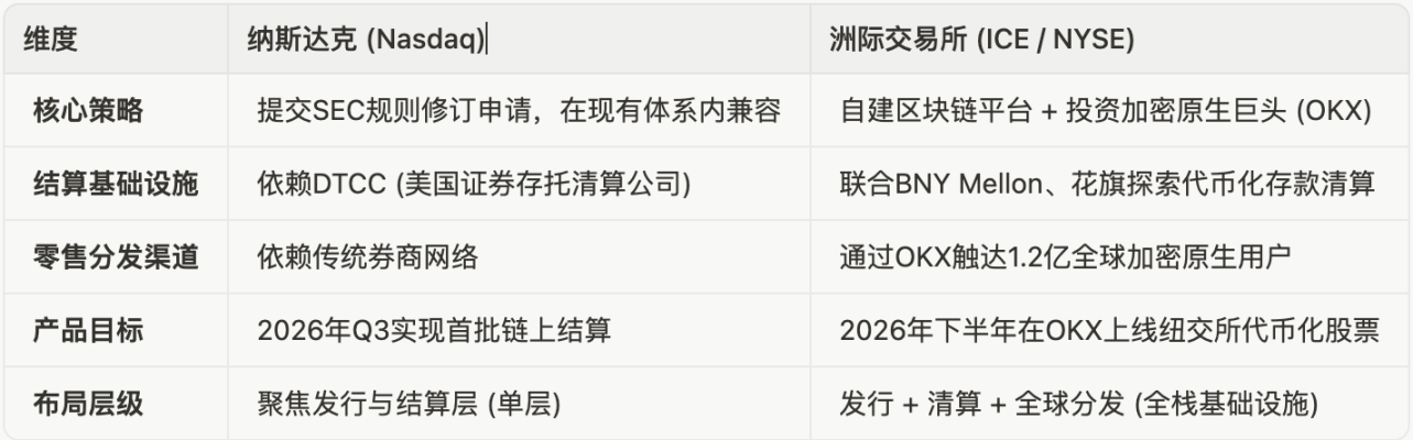 在资产代币化的基建推演中,市场分化出两条截然不同的演进路线。纳斯达克倾向于改良主义,依托 DTCC (美国存管信托与清算公司)等传统清算中心,在现有合规体系内完成代币化资产的登记与流转。相比之下, ICE 的战略布局呈现出明确的垂直整合特征,试图重构从资产封装到终端分发的全链路闭环: