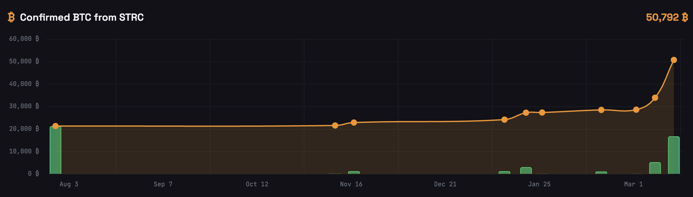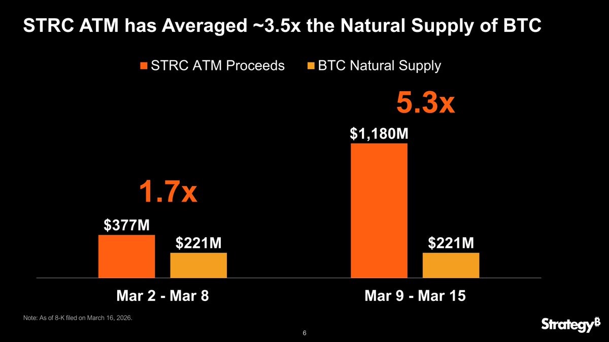 特别是在最近一周,STRC贡献约2.2万枚比特币,占期间整体增持的43.5%,对应Strategy同期增持规模的54.8%。其中,3月9日资助买入5315枚比特币,相当于同期全网挖矿总产出的1.7倍;3月16日更是达到16816枚,相当于全网产出的5.3倍。