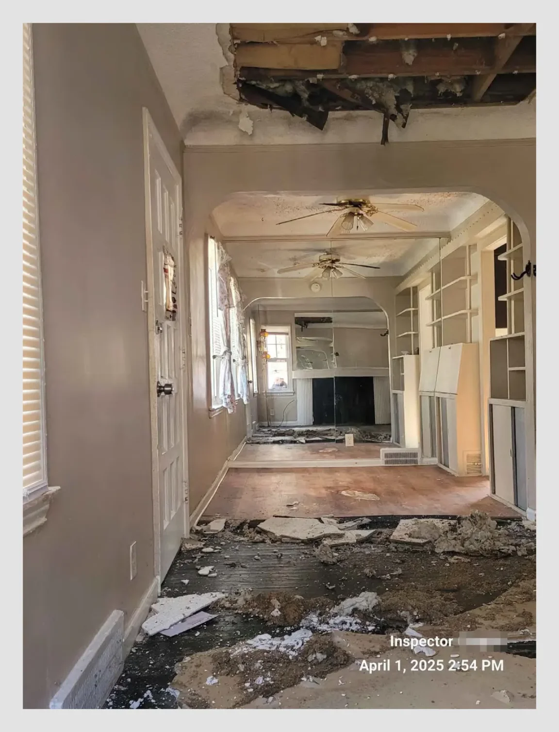 Fielding 街 18415 号的天花板坍塌,走廊上堆满石膏块和潮湿的绝缘材料