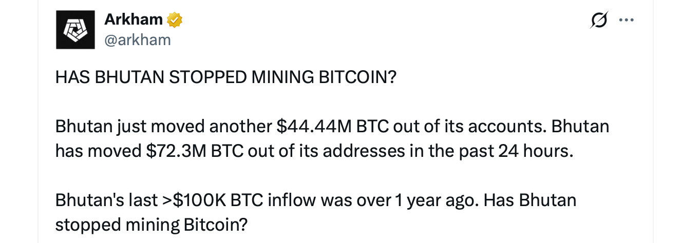 Arkham的数据还显示,不丹在一年多的时间里没有记录到显著的挖矿流入,提出了关于生产是否在2024年减半后放缓或因能源配置和战略变化而转变的问题。