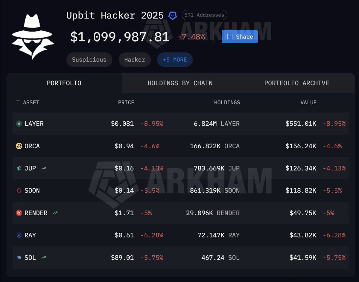 Upbit 黑客最初从 Upbit 偷走了超过 $3000 万的加密货币,并且仍然持有约 $100 万的代币,这些代币流动性太差,无法出售。